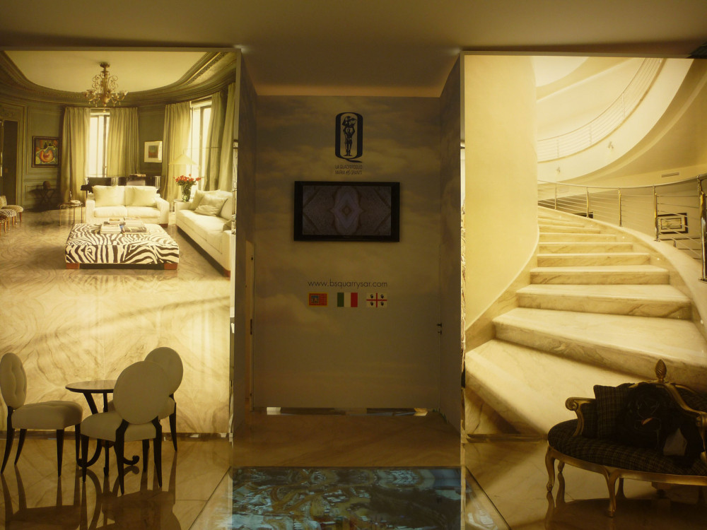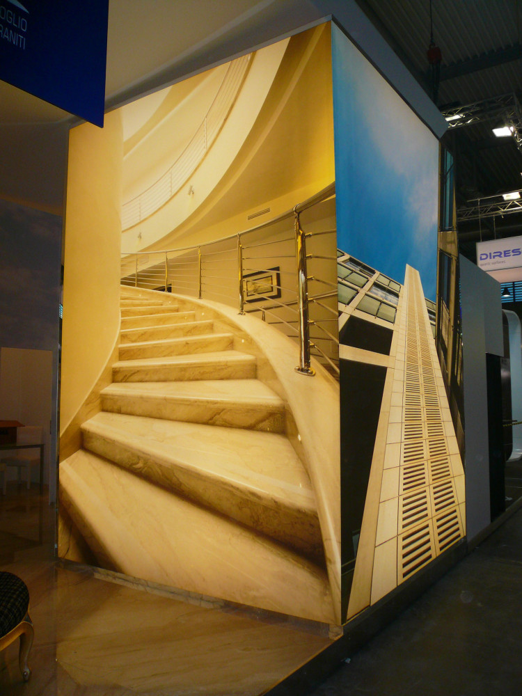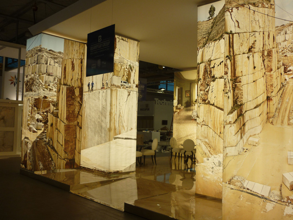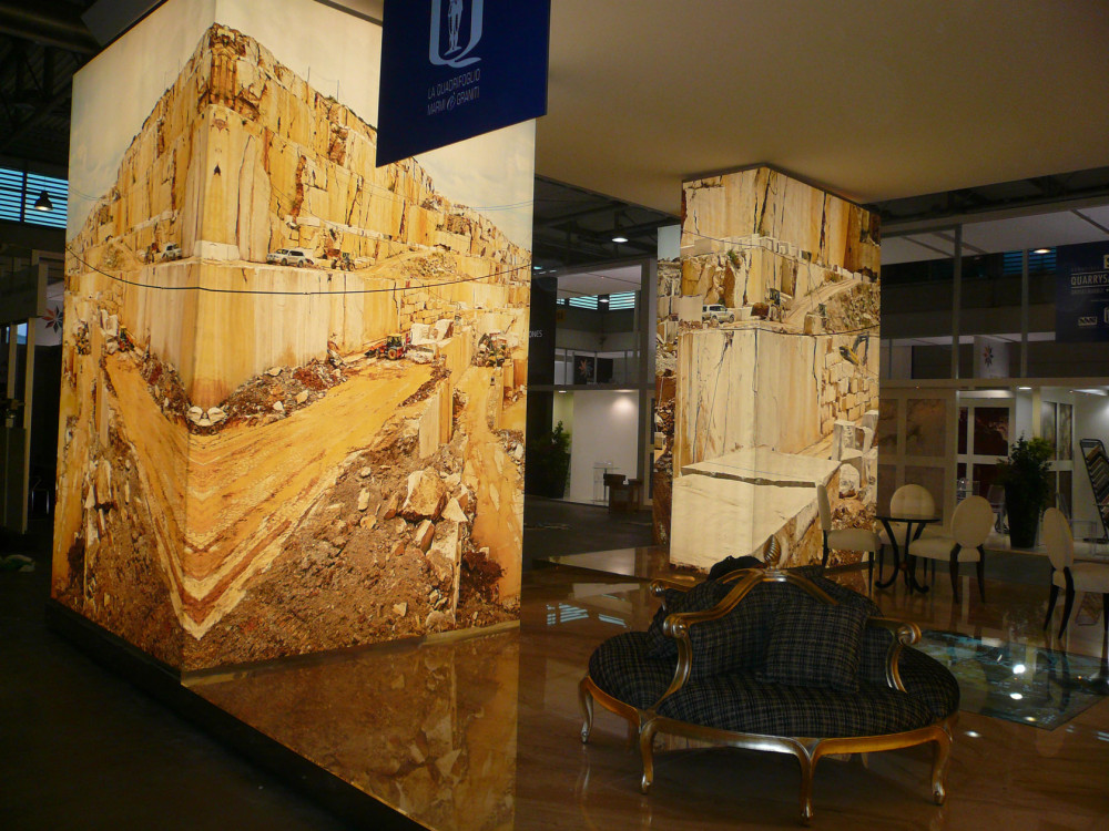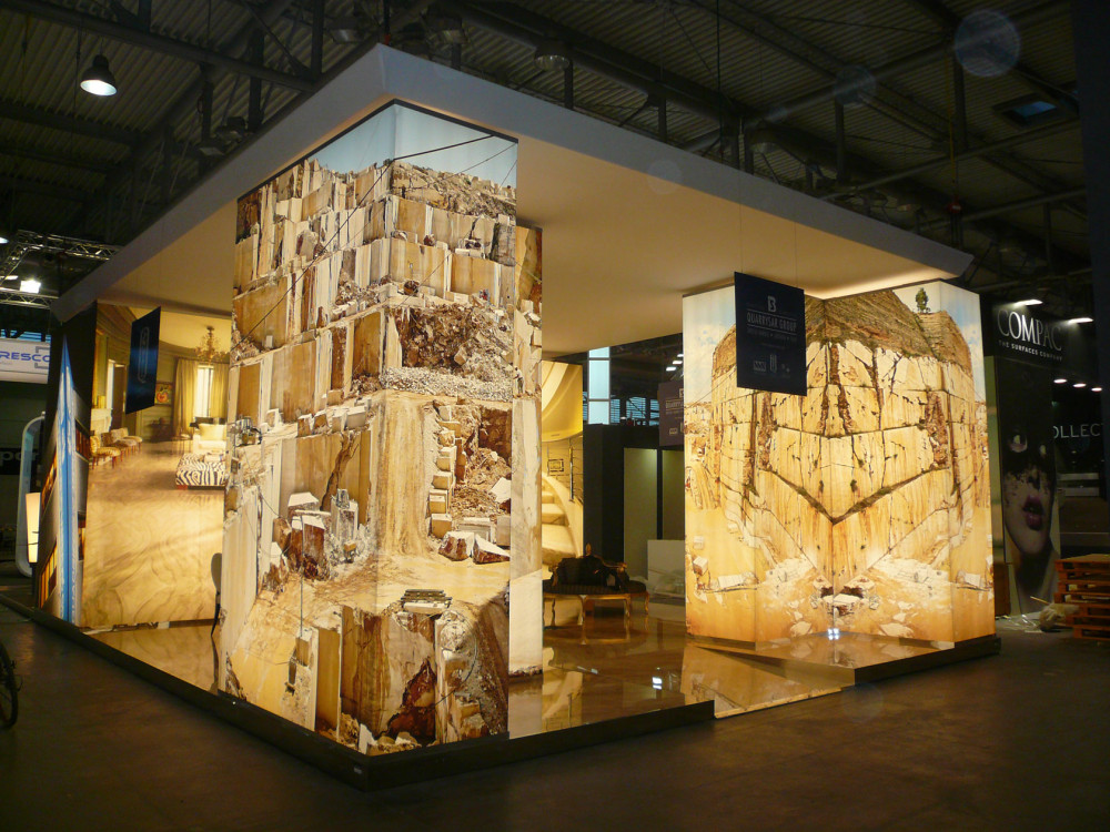 Qui abbiamo superato noi stessi. La qualità della stampa, insieme alla cura del dettaglio nel montaggio, hanno portato a questo spettacolare risultato di luce e immagini. Uno stand che al Marmomacc 2012 ha di certo catturato l’attenzione di molti, sia durante il montaggio, che a lavori finiti. Praticamente tutto interamente graficato, questo stand colpiva per la sua maestosità, 5 mt di altezza, e per la luce che emetteva. L’azienda che ce l’ha commissionato voleva far sì che sembrasse di entrare nella loro cava di marmo in Sardegna; le immagini retroilluminate e la qualità di stampa senza punti di giunzione, hanno fatto il resto.